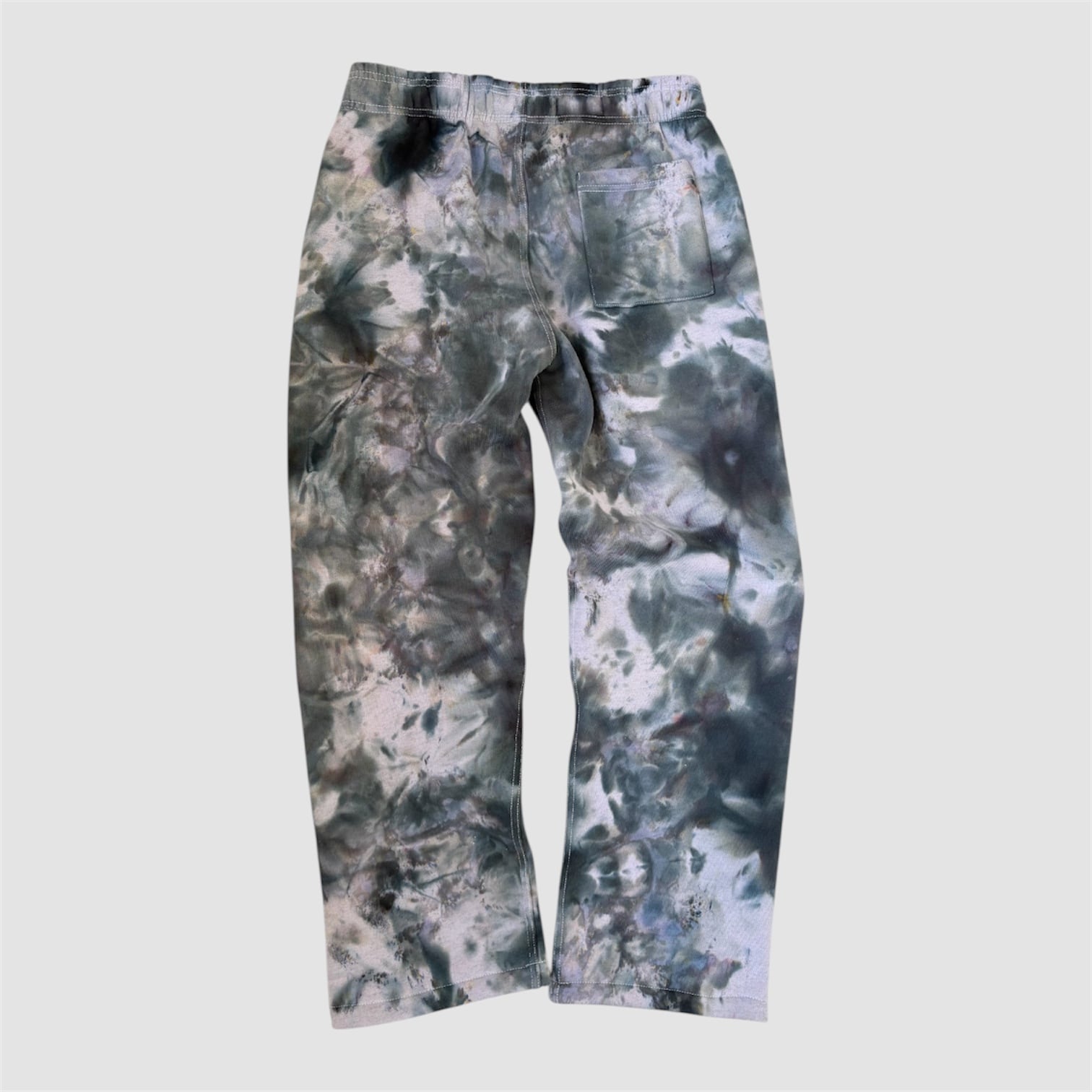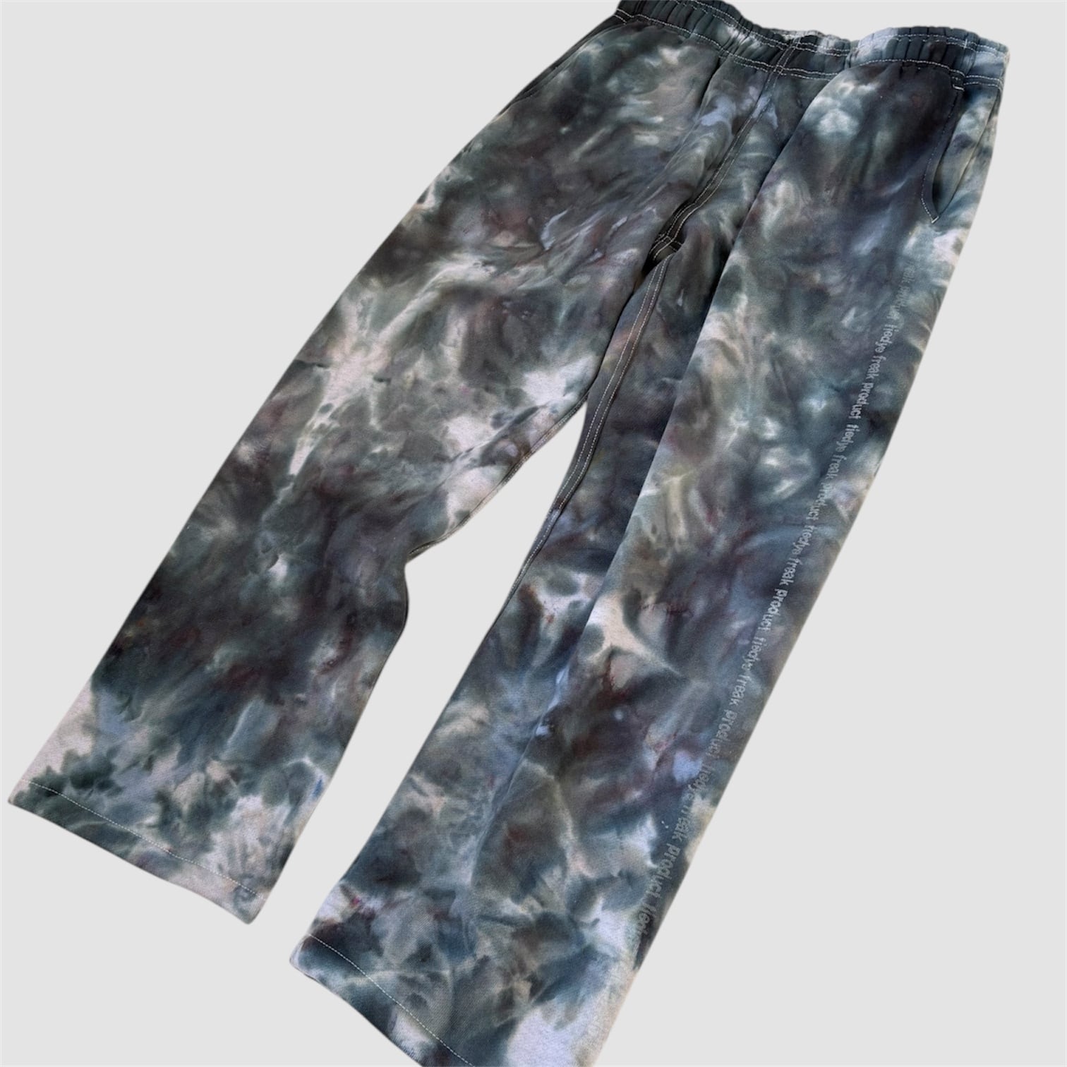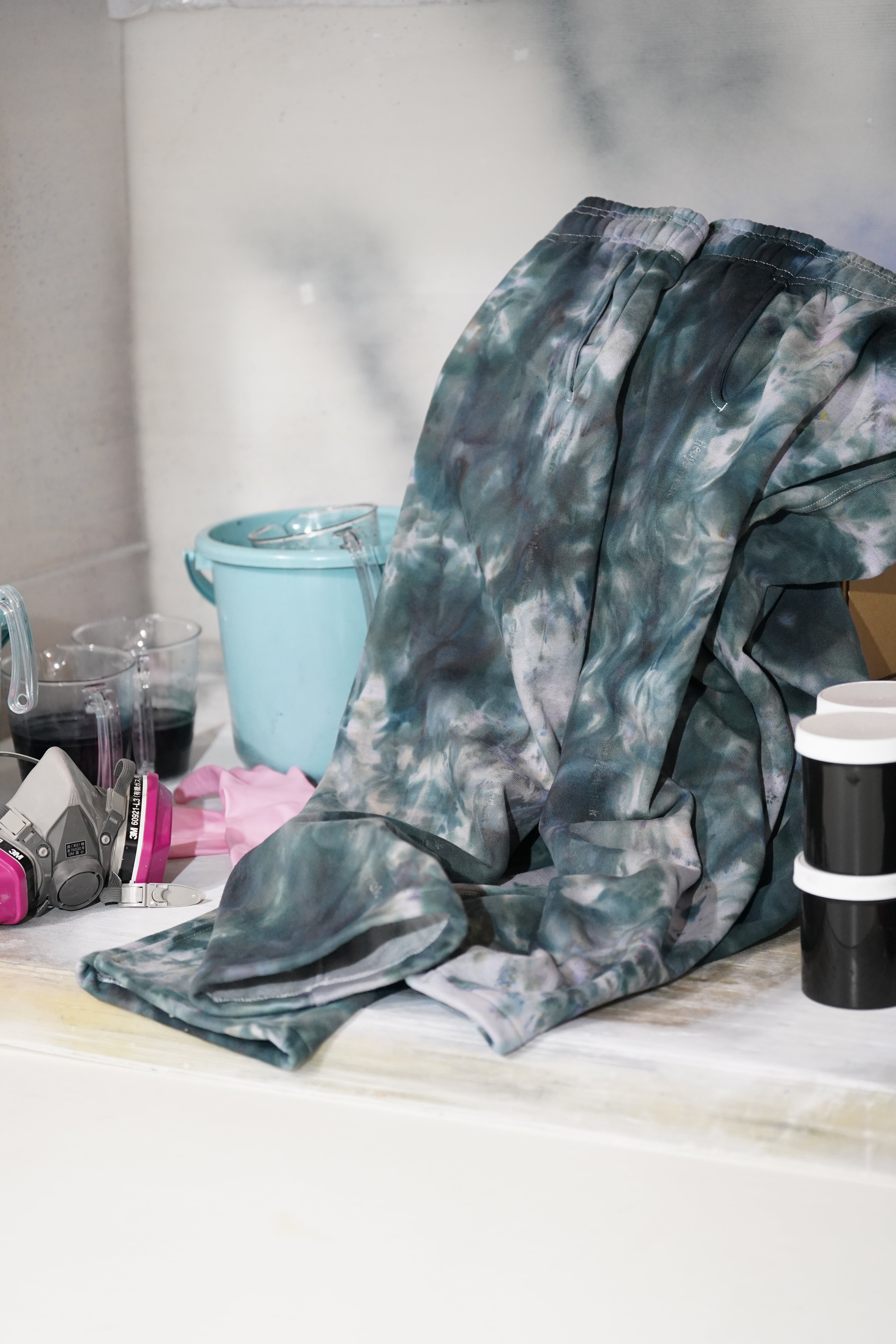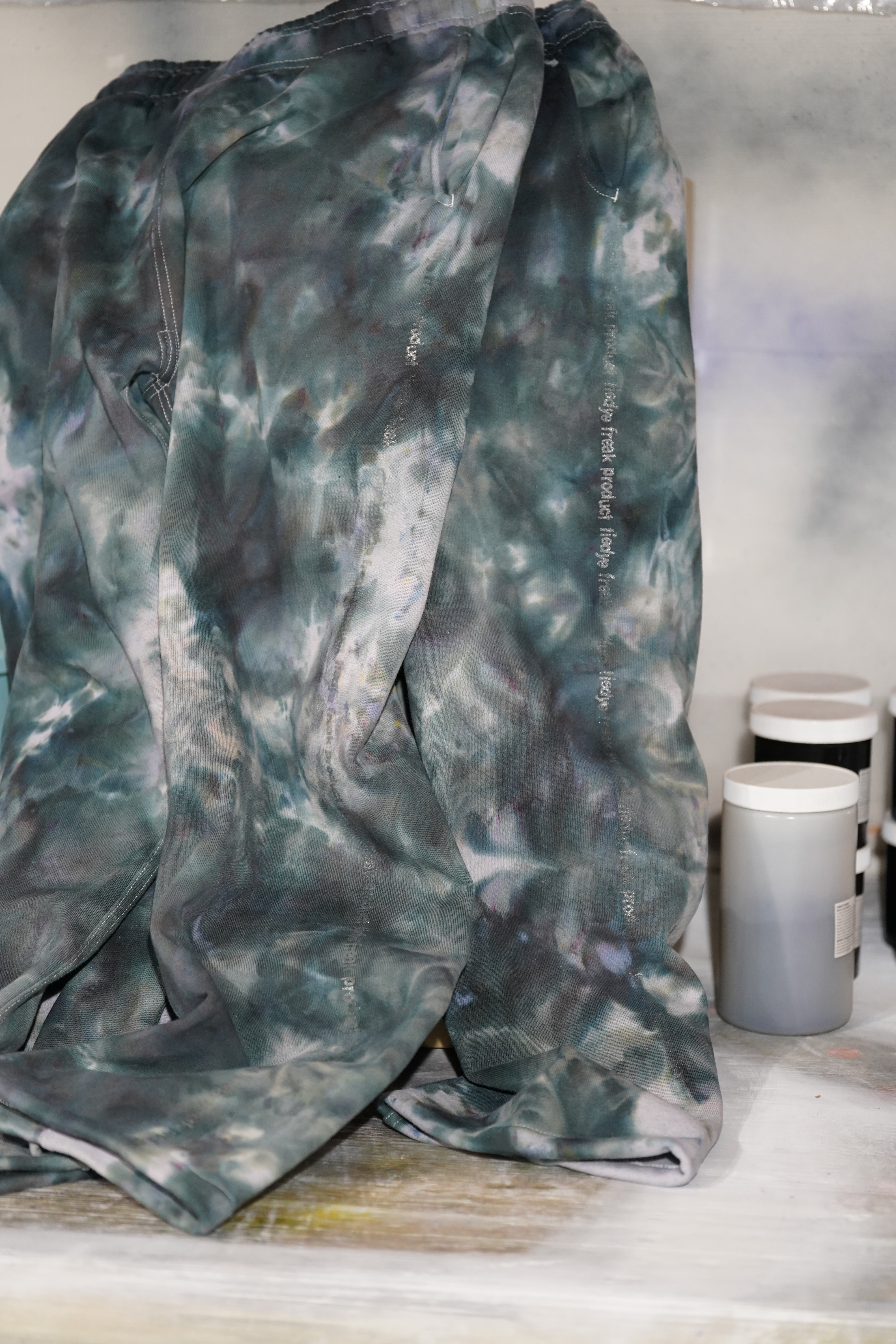 Taking advantage of the ice-dye process, vertical line lettering is created on the left side using phosphorescent print.
